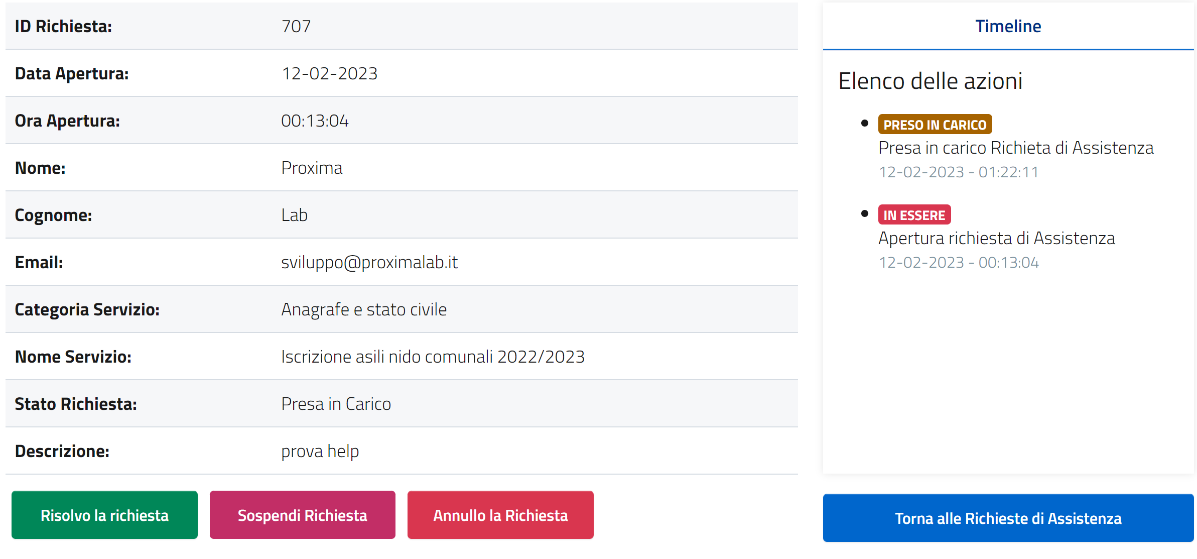 apparirà la schermata con il dettaglio della richiesta e la "TIMELINE" con l'elenco riepilogativo di tutte le azioni svolte su quella specifica
