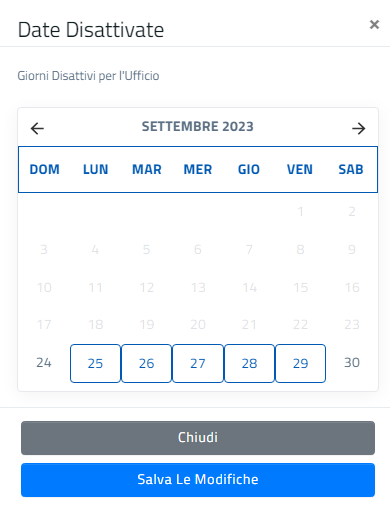 Cliccando sulla voce del menù a tendina "Date disattivate" è possibile configurare i giorni in cui è impossibile per l'utente chiedere appuntamento.